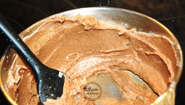 - Set sauce pan to medium heat and stir with spatula frequently until batter forms a thick paste – should take 5 minutes.